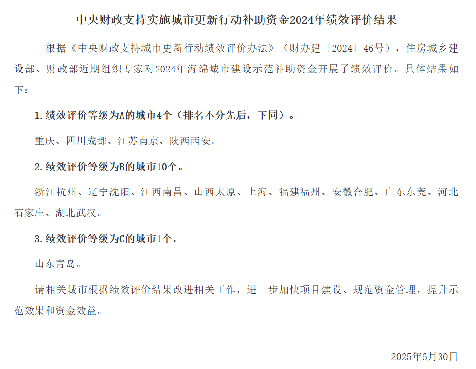 7月1日,据财政部官网消息,根据《中央财政支持城市更新行动绩效评价办法》,住房城乡建设部、财政部近期组织专家对2024年海绵城市建设示范补助资金进行了绩效评价。